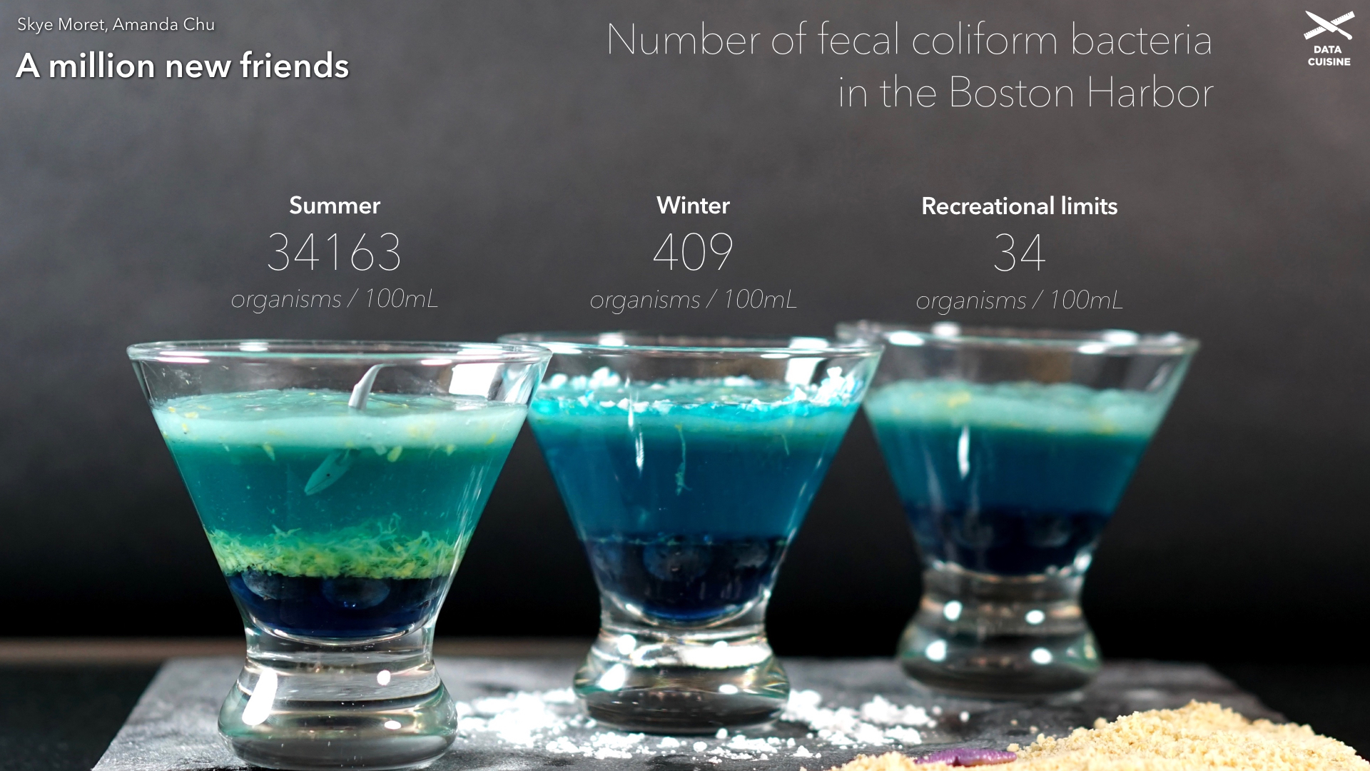From above, all three Vodka jello shots look almost the same. A non-transparent light blue layer doesn’t allow to see what’s under the surface — just as the water in the Boston Harbour looks like throughout the year. But independent of when in the year you take a bath, you will always make contact with more faecal coliform bacteria than considered harmless. In proportion to the average amount of coliform bacteria in summer and winter, lemon zest is added to the jellos. Use blueberries for the harbour rocks and add a plastic wale to the summer version and candy cane and powder sugar to give an impression of snow and slush in the winter version. The third glass shows the max amount of coliform within the recreational limits.