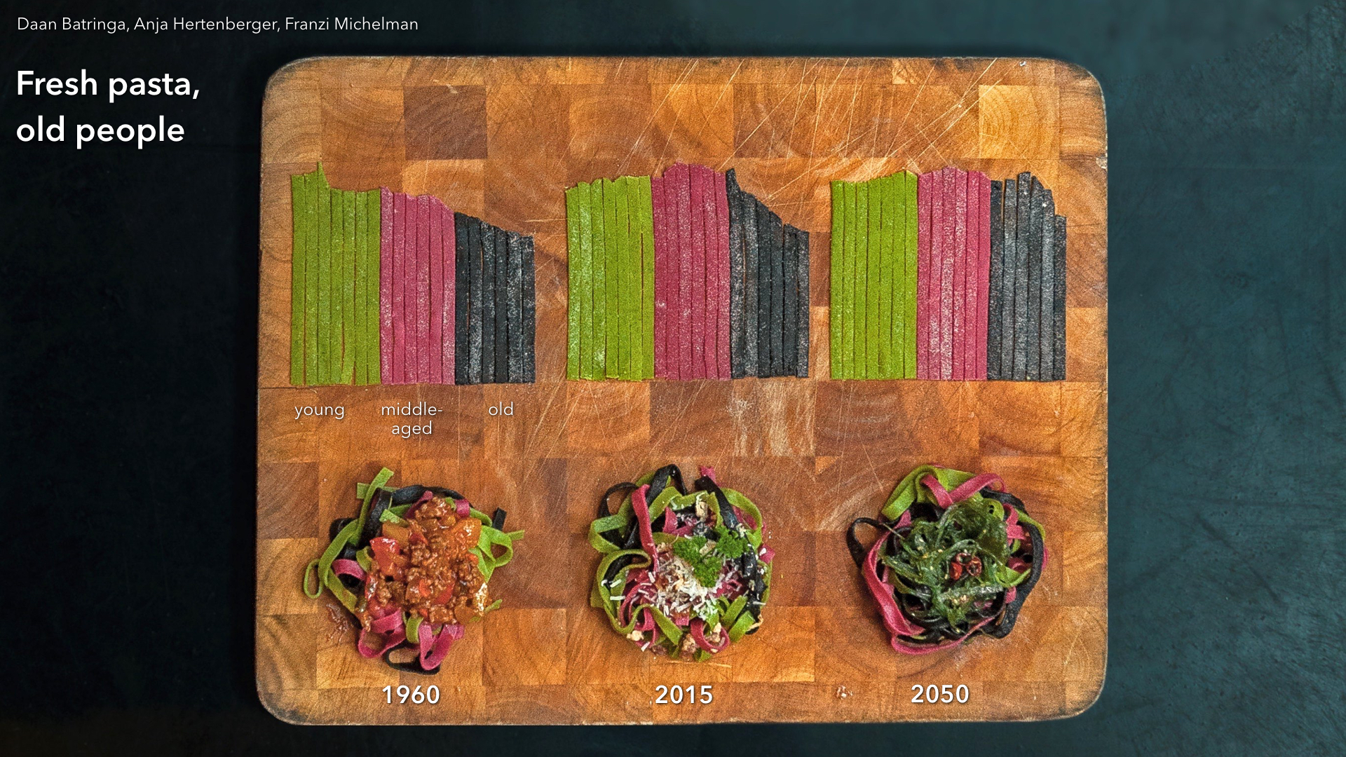 Using data in the form of the population pyramid of Dutch citizens in 1960, 2015 and 2050, a pasta graphics is created. The three colours represent the young (green), the not-so-young-anymore (red) and the old (black). In order to give a taste of the different age groups, the 1960’s pasta is topped with a meat sauce made with a prefab blend of spices by Knorr. The 2015 ‘back-to-basics’ pasta comes with Carbonara, and the pasta of the future is a mix of noodles and Wakame salad.