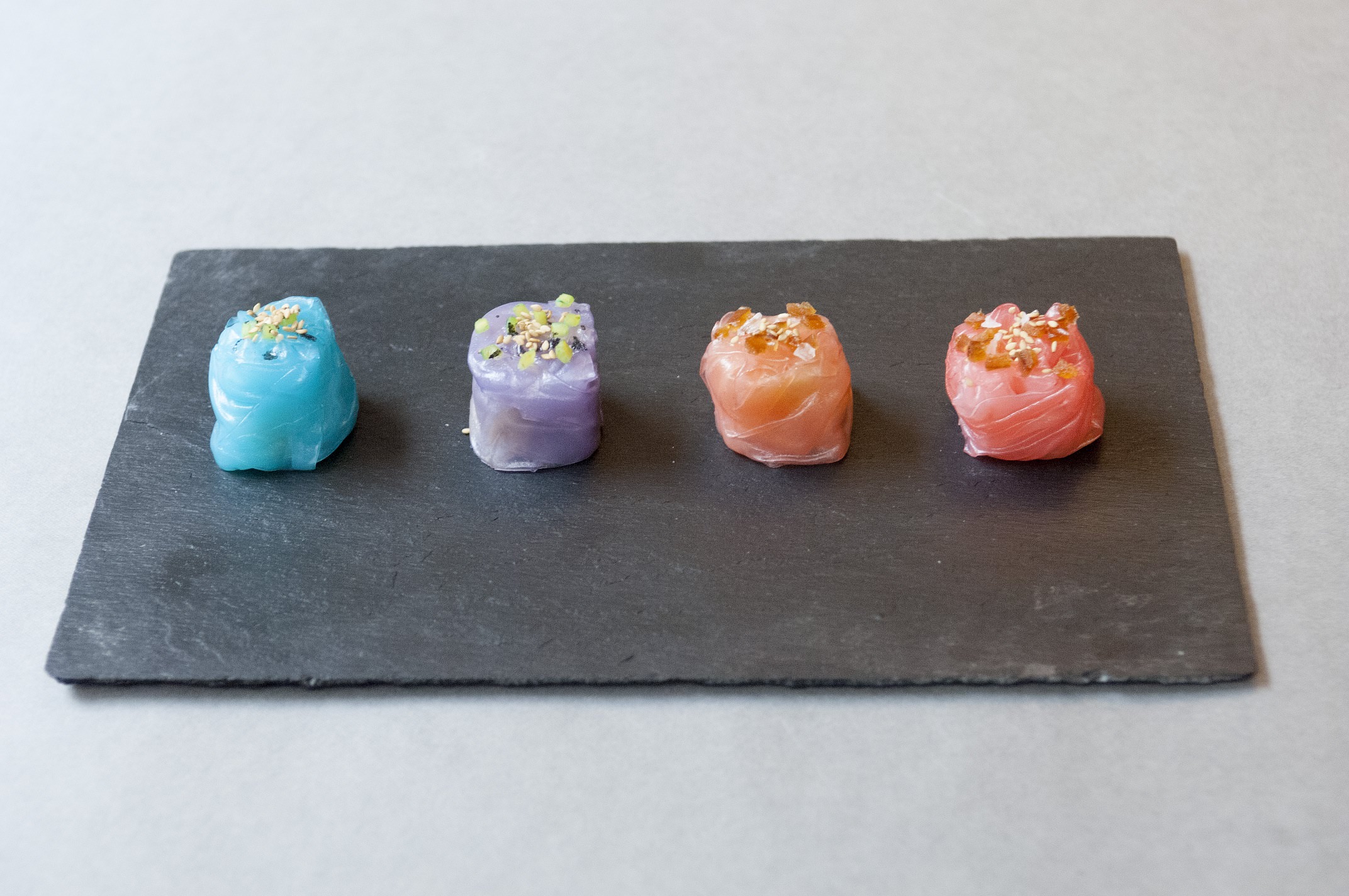 How often do couples have sex compared to singles? This dish answers this question based on an informal survey among the cooks’ Facebook contacts. The rice paper dumplings have two different fillings: men are represented by a reduction of meat, while the "female" dumplings are filled with a fish reduction –– a choice based on the Spanish way to describe sex with men and women. Whether it’s men or women in a couple or not having a partner can be deducted from the color –– the lighter colors indicate the singles. The amounts of sesame and salt on top indicate the frequency of sexual encounters of the different groups.