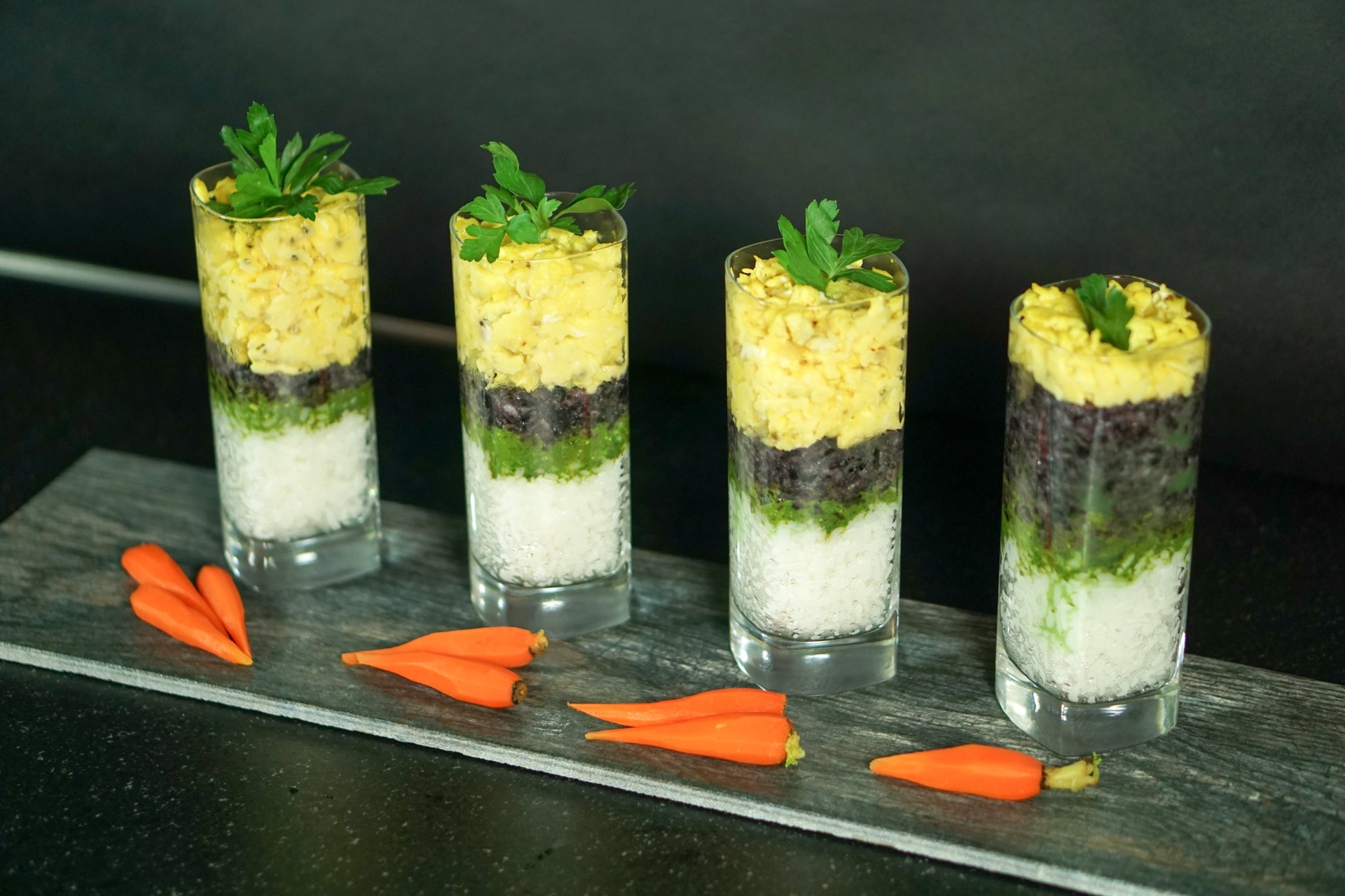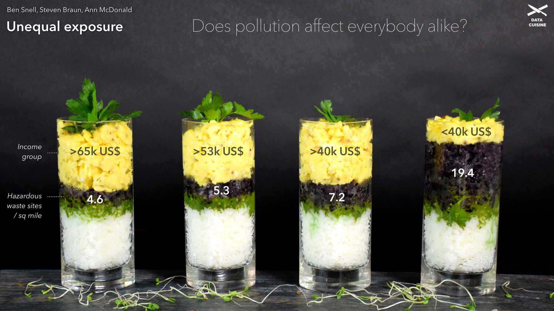 This Bostonian layered rice dish makes a critical statement about the class-based disparities in relation to densities of hazardous waste sites in Massachusetts. Basically it shows that the poorer you are, the more you are exposed to pollution. Hence, the black rice increases with the density of waste sites, with a dramatical looking sewage of waste (pesto) of the upper layer into the soil (white rice). Finally, the amount of scrambled egg on top indicates the income group.