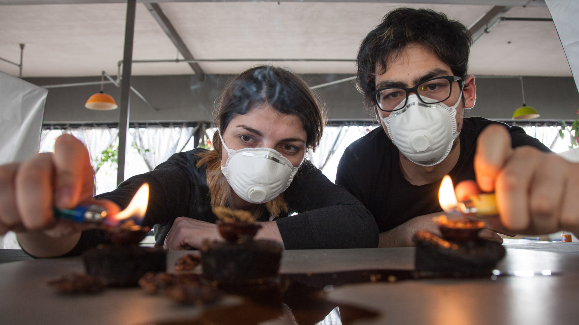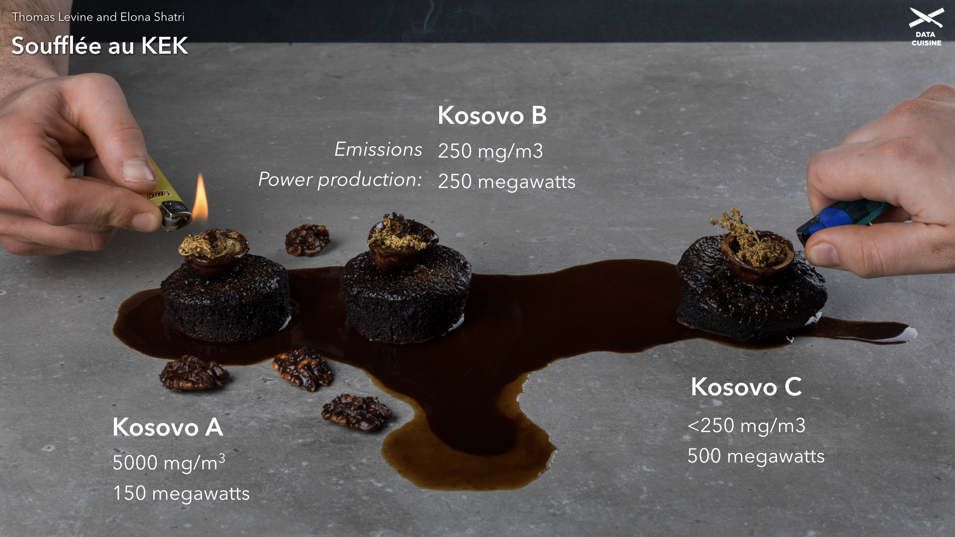 The chocolate inside is proportional to the dust pollution, and that varies dramatically, since plant A is a massive polluter. But because they all run on coal or lignite, they all pollute – which you can see from the smoke produced by burning tea on the soufflés’ top.