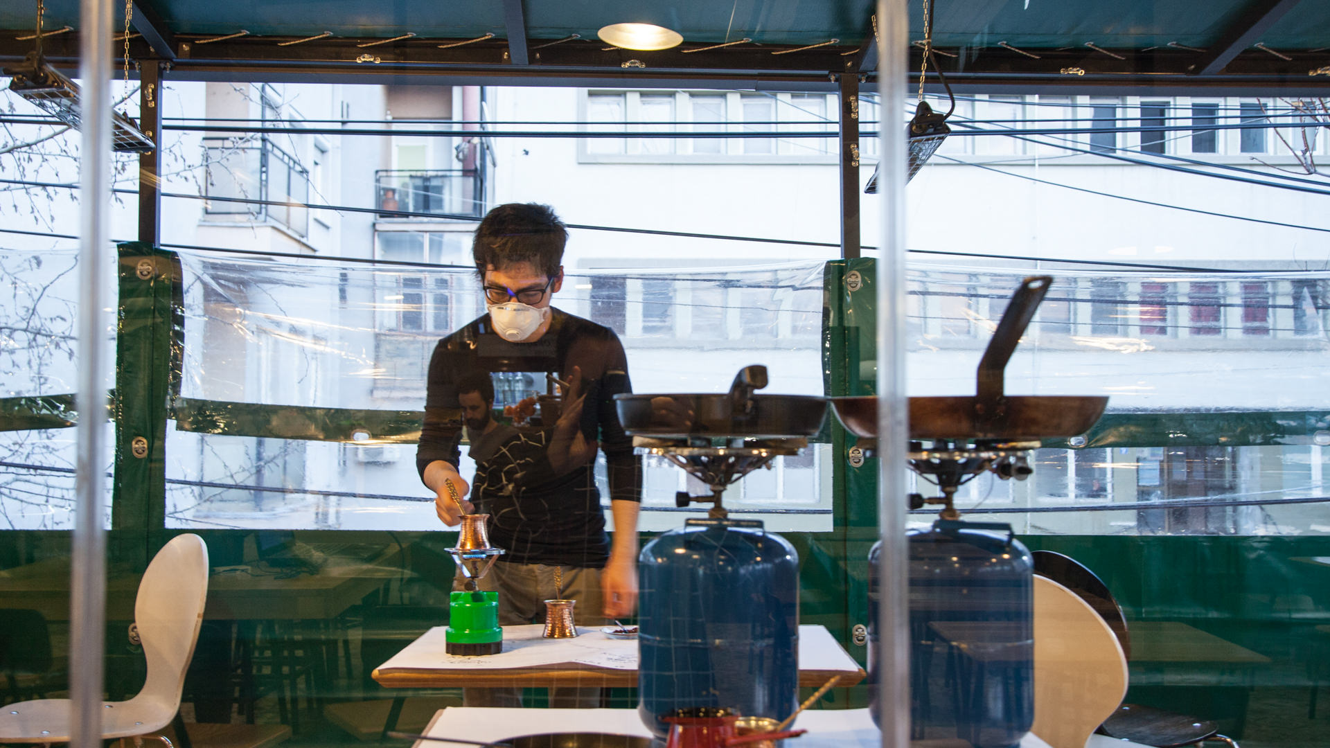 The coffee-making performance follows a strict script, in which the two performers make contradictory statements about the three power plants.