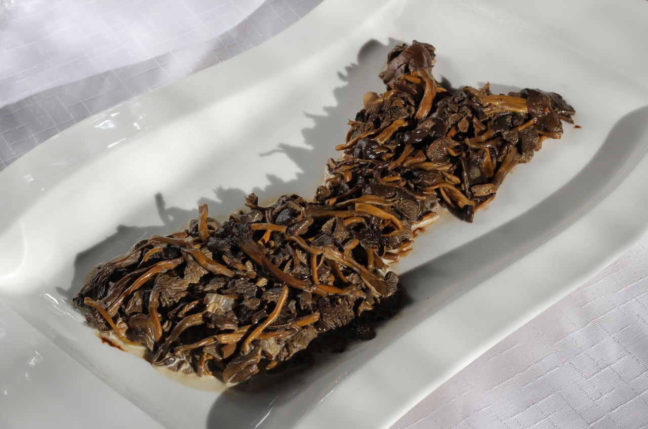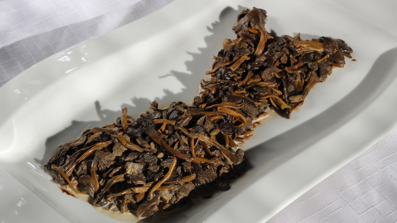 A mushroom soup, symbolizing suicide rates in Finland. The south is more sunny, and has a creamier, richer soup, representint less suicides. The north is darker and has a more mushroomy soup, both symbolizing more demanding living situation, but also nature's compensation for the lack of light — the high amount of vitamin D in mushroom.