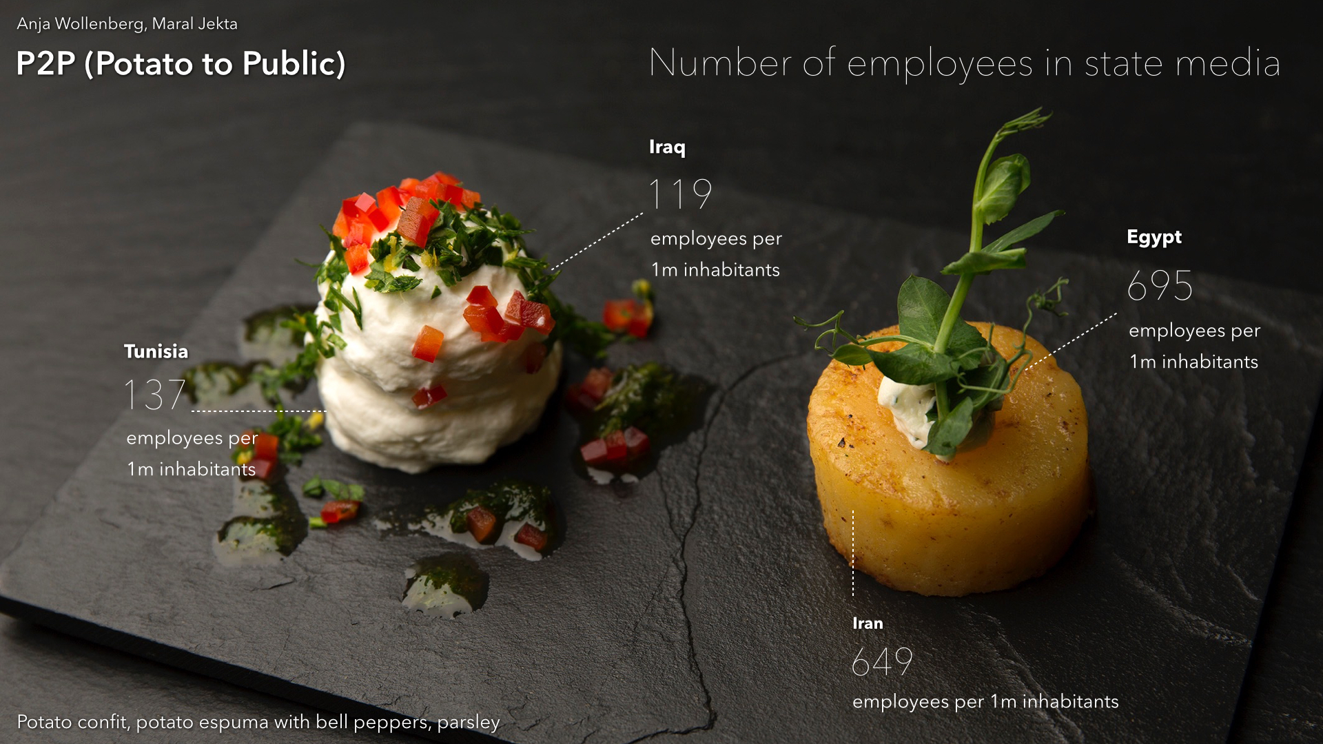 MiCT is a German non-profit organisation that implements media development projects in the Middle East, Northern Africa and other regions. The data dishes for the flying buffet were created in a two-day workshop with MiCT's media experts. They chose subjects and data relevant to their work with various communities and took inspiration from different local cuisines.