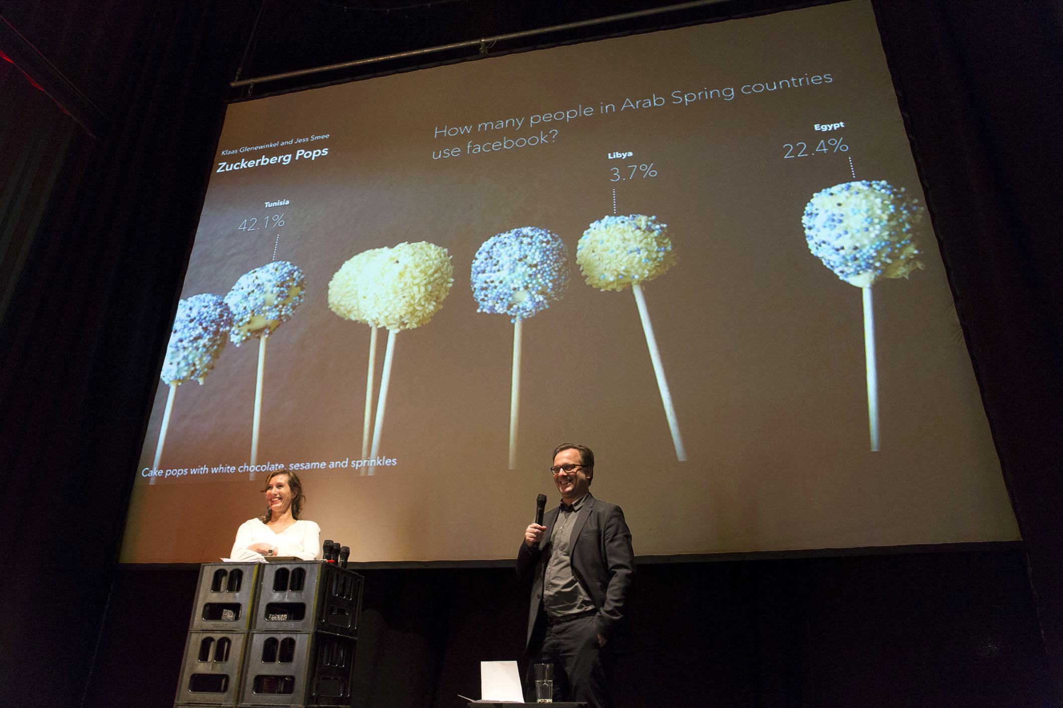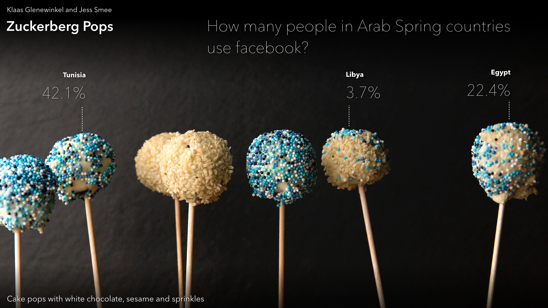 The results ranged from Tweeting Tabouleh over Halal Internet blocked by delicious barberry chutney to Cake Pops visualizing the percentage of Facebook usage in various countries by sugar sprinkles.