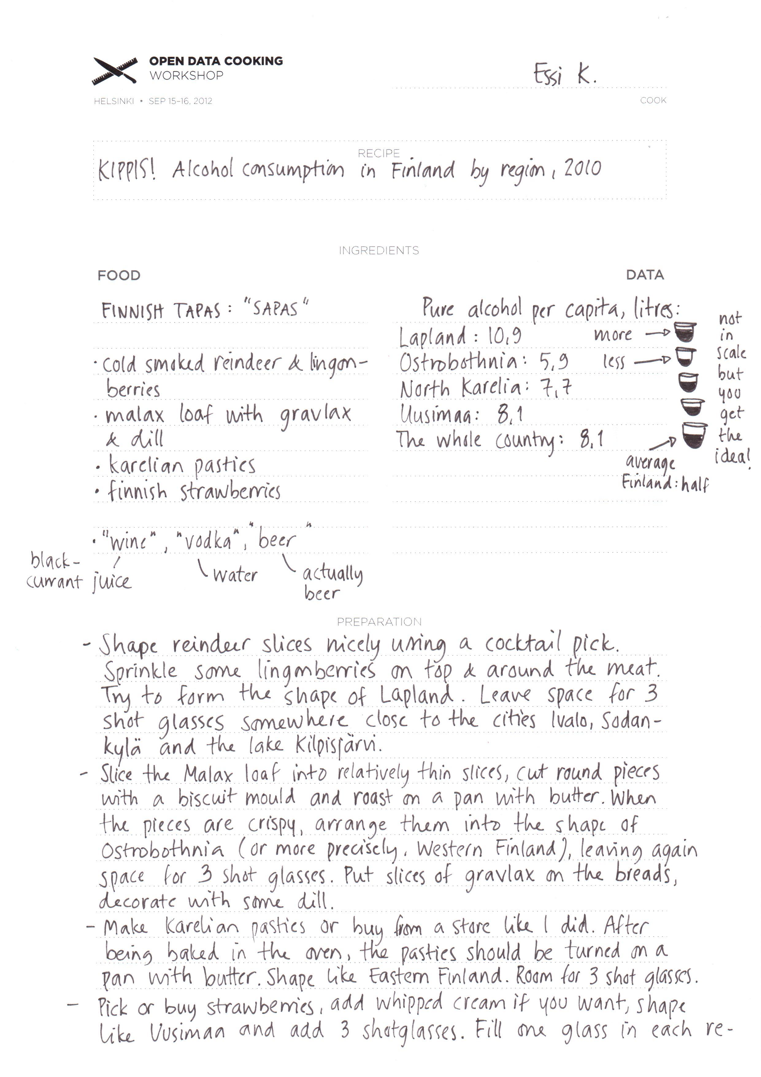 The first Data Cuisine Workshop was called "Open Data Cooking" and took place in Helsinki, September 15-16, 2012. It was produced by Pixelache and kindly supported by Goethe Institute. On the culinary side, the workshop was supported by food expert Antti Nurkka. Miska Knapek advised the participants on open data in Finland.